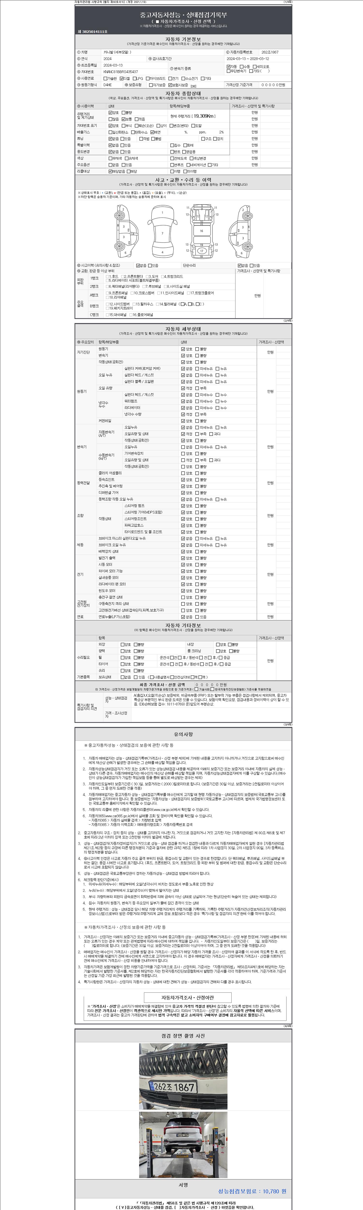 | 주행거리 | 19,309 km | 차량번호 | 262조1867 | 사고유무 | 성능기록부 참조 | 제시번호 | 제 2147483647 호 |