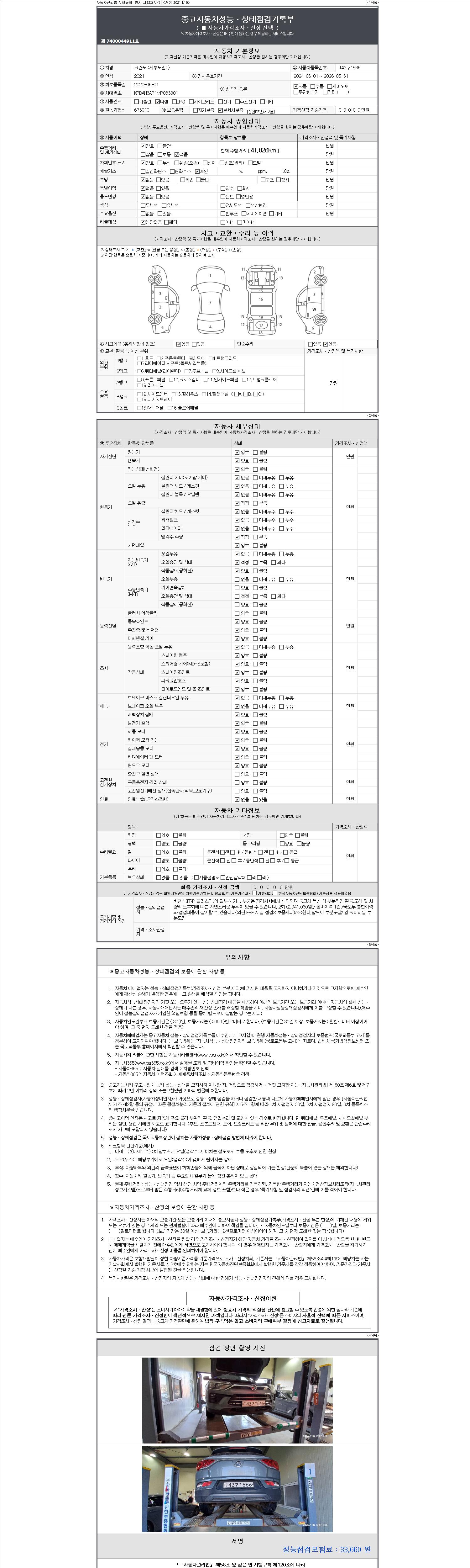 자동차관리법 시행규칙 제120조의 규정에 따라 별지 제 82호서식 《중고자동차 성능, 상태점검 기록부》를 발행한 성능, 상태점검자 및 매매자는 아래의 보증기간 또는 보증거리 이내의 중고자동차, 성능점검 기록부에 기재된 내용과 자동차의 실제 성능, 상태가 다른 경우 계약 또는 관계법령에 따라 매수인에 대하여 책임을 집니다.