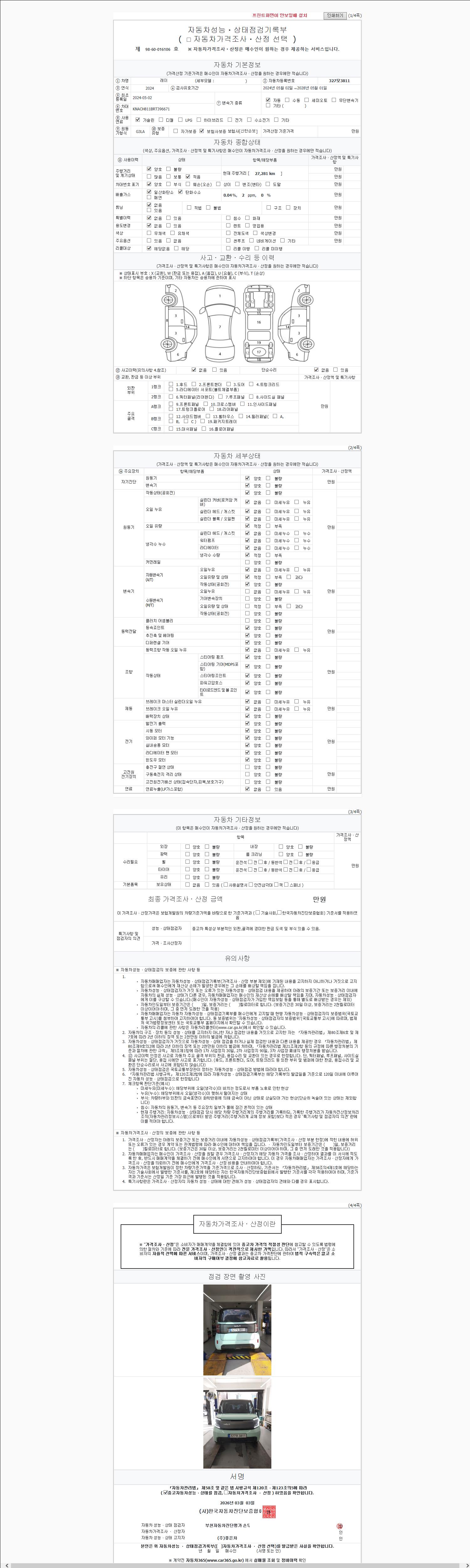 | 주행거리 | 27,281 km | 차량번호 | 327모3811 | 사고유무 | 성능기록부 참조 | 제시번호 | 제 2026041302 호 |