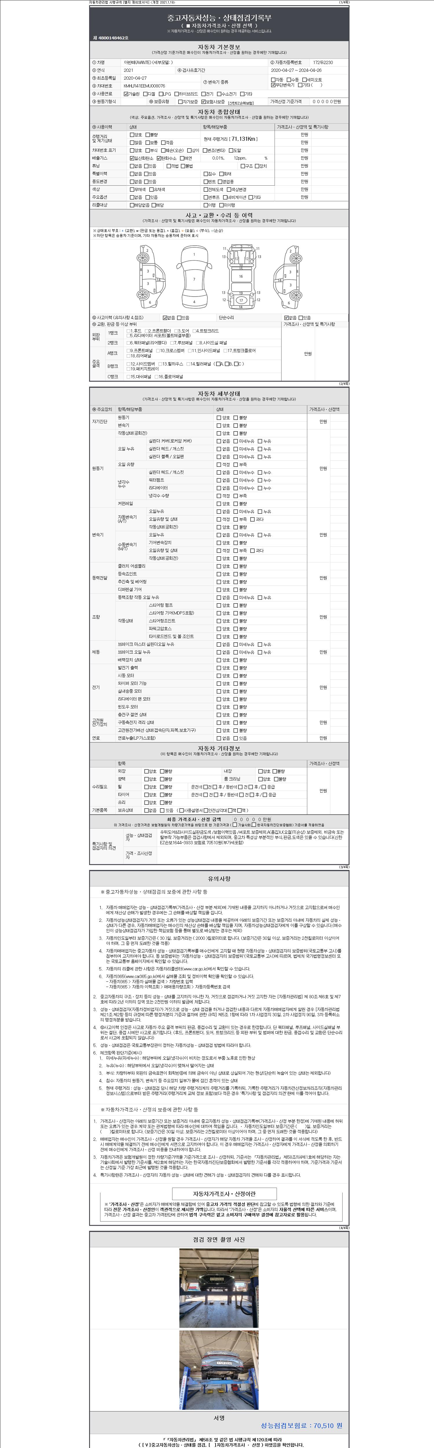 | 주행거리 | 71,131 km | 차량번호 | 172두2230 | 사고유무 | 성능기록부 참조 | 제시번호 | 제 2147483647 호 |