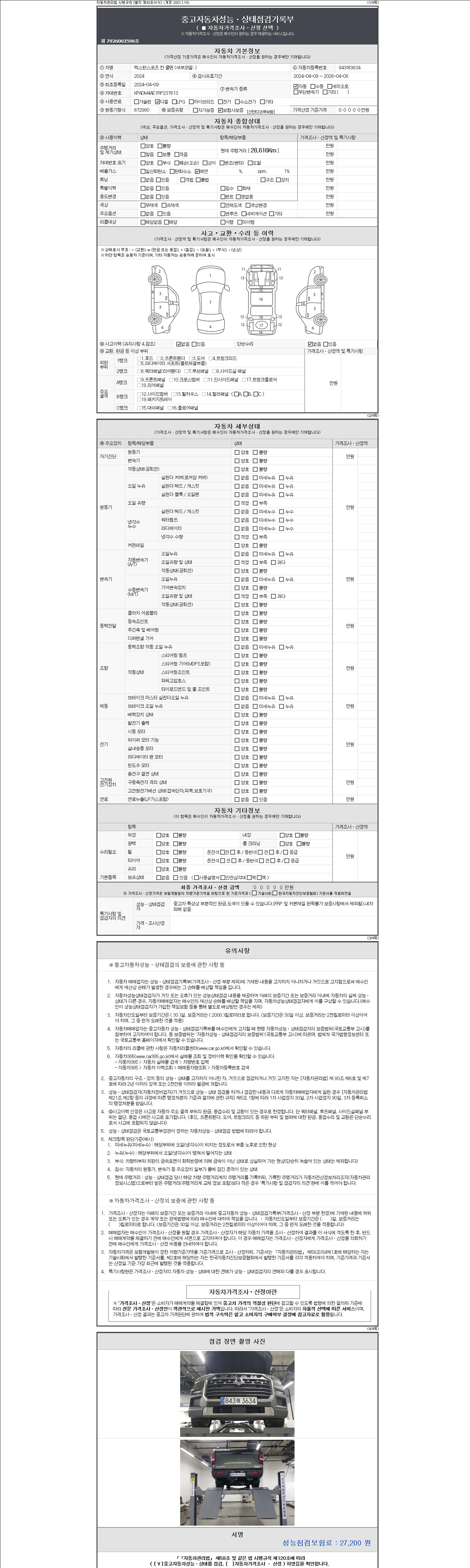 | 주행거리 | 28,616 km | 차량번호 | 843머3634 | 사고유무 | 성능기록부 참조 | 제시번호 | 제 2147483647 호 |