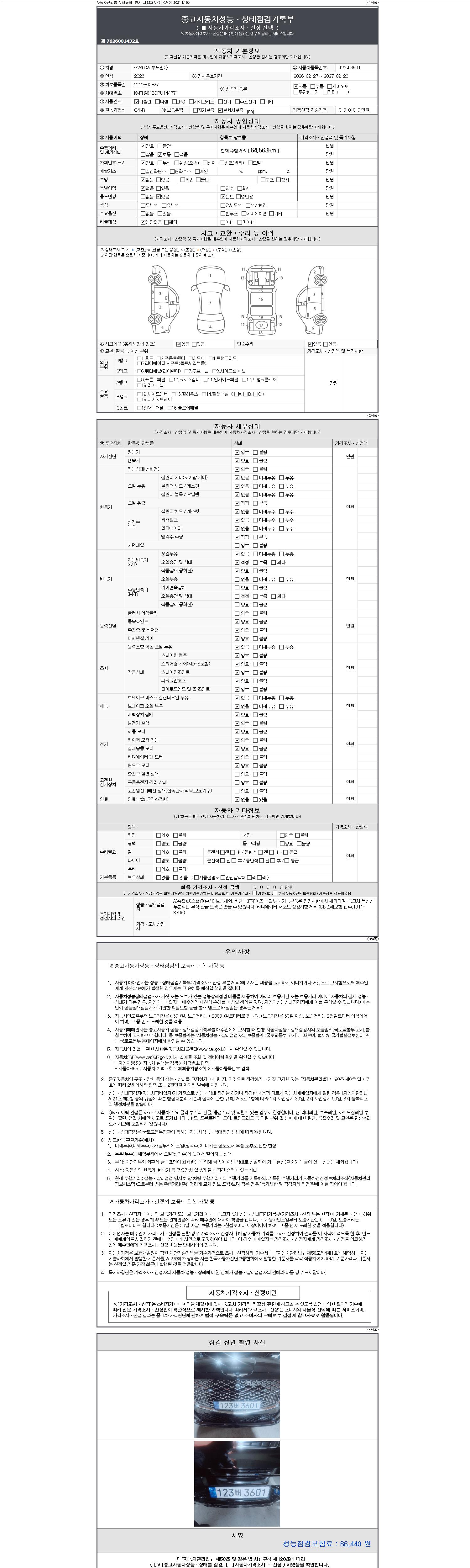 | 주행거리 | 64,563 km | 차량번호 | 123버3601 | 사고유무 | 성능기록부 참조 | 제시번호 | 제 2147483647 호 |