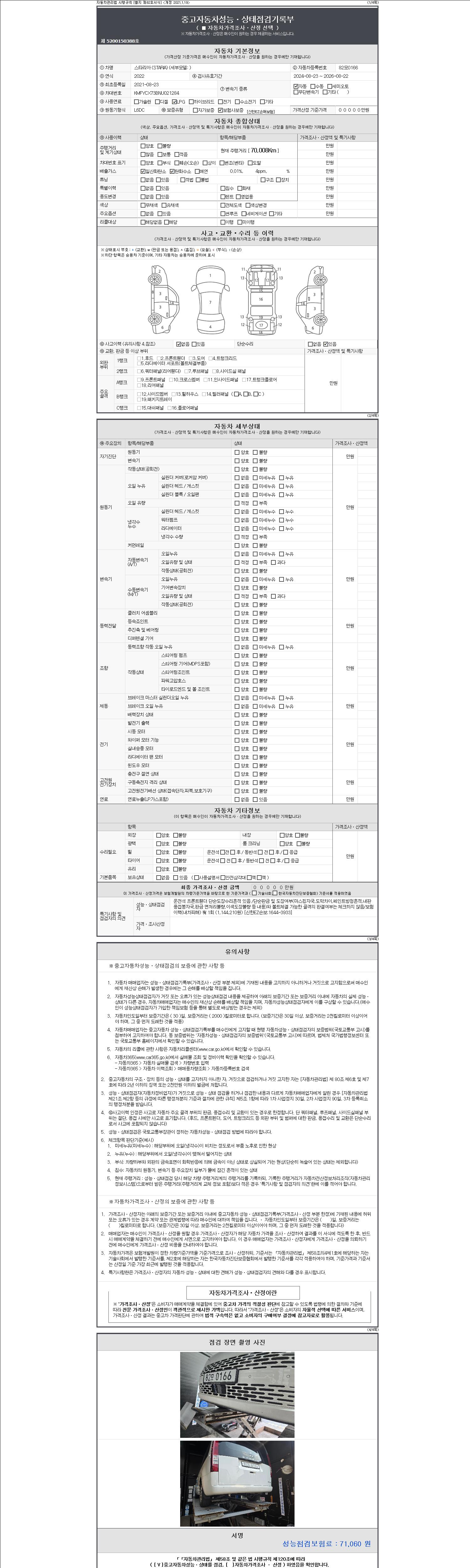 | 주행거리 | 70,008 km | 차량번호 | 82모0166 | 사고유무 | 성능기록부 참조 | 제시번호 | 제 2147483647 호 |